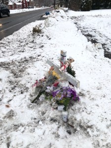 With quiet respect, I stood stationary at the spot, my bright yellow uniform jacket drawing attention of passers-by to the memorial, by now flush with a potpourri of colorful flowers and trinkets laying against a dusting of fresh snow. Vehicles slowed, some waved, but many stared, mournfully and solemnly.